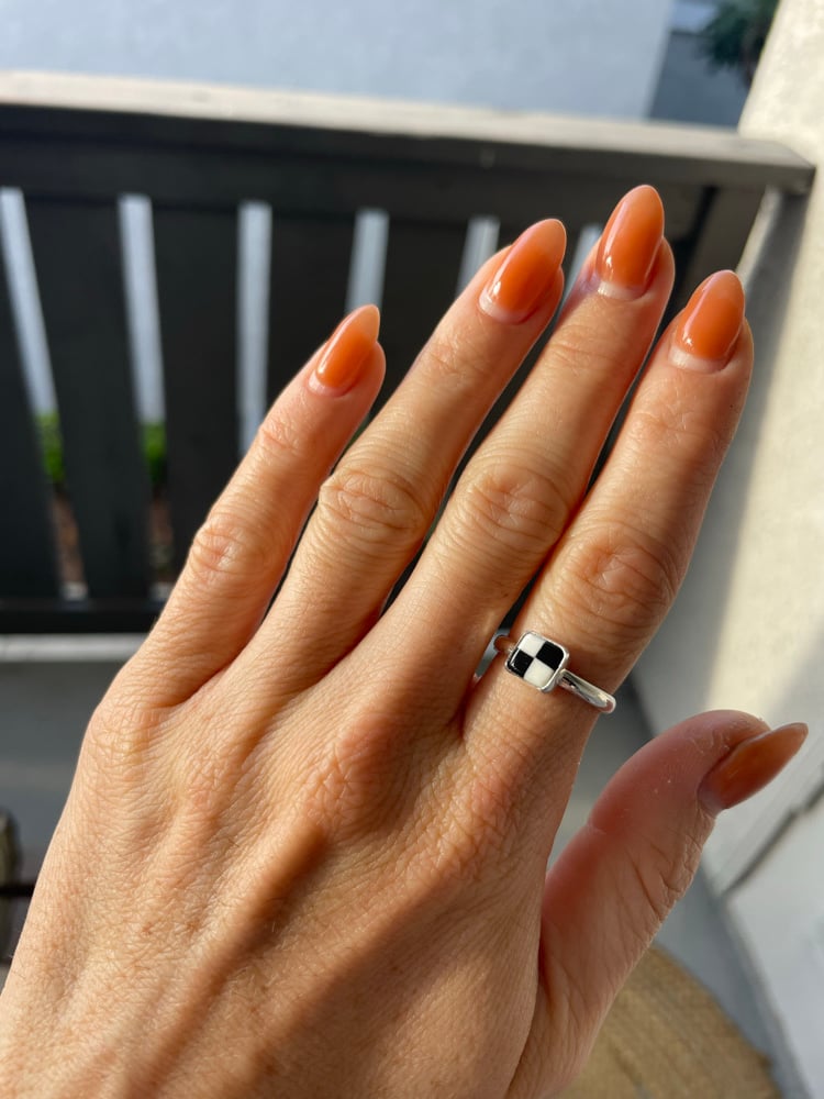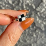Howlite and black onyx set in sterling silver. There are two sizes available to choose from below.